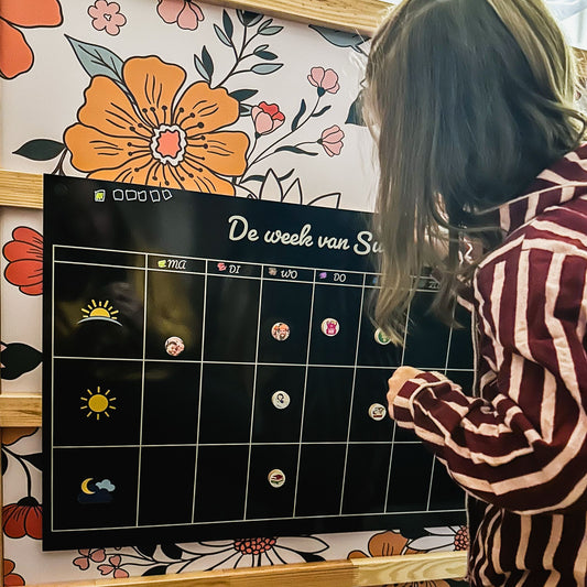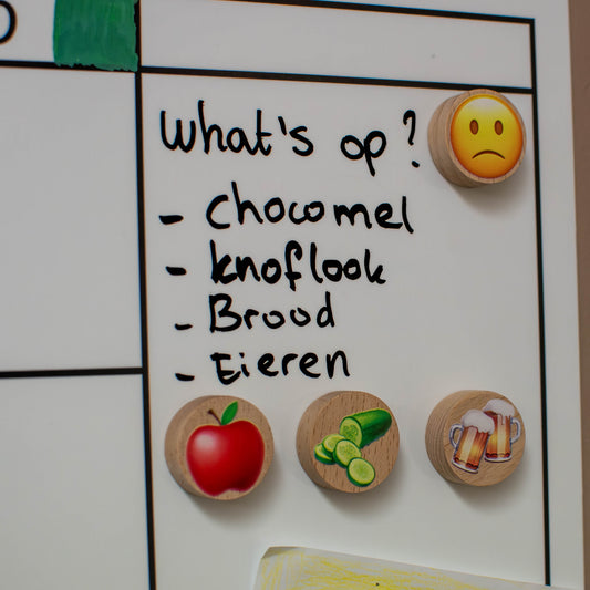 Geef kleur aan je borden met onze krijtstiften, deze zijn te gebruiken op al onze planborden en geven je planbord een extra mooie en gezellige uitstraling! Personaliseer ook je eigen magneten met emoji's of foto's! Super handig voor de allerkleinsten die nog moeite hebben met lezen. Berg je stiften mooi op met onze stiftenhouder en ook leuk; ons rekje "on the side" handig om losse papiertjes, kaarten, foto's of tekeningen aan op te hangen.