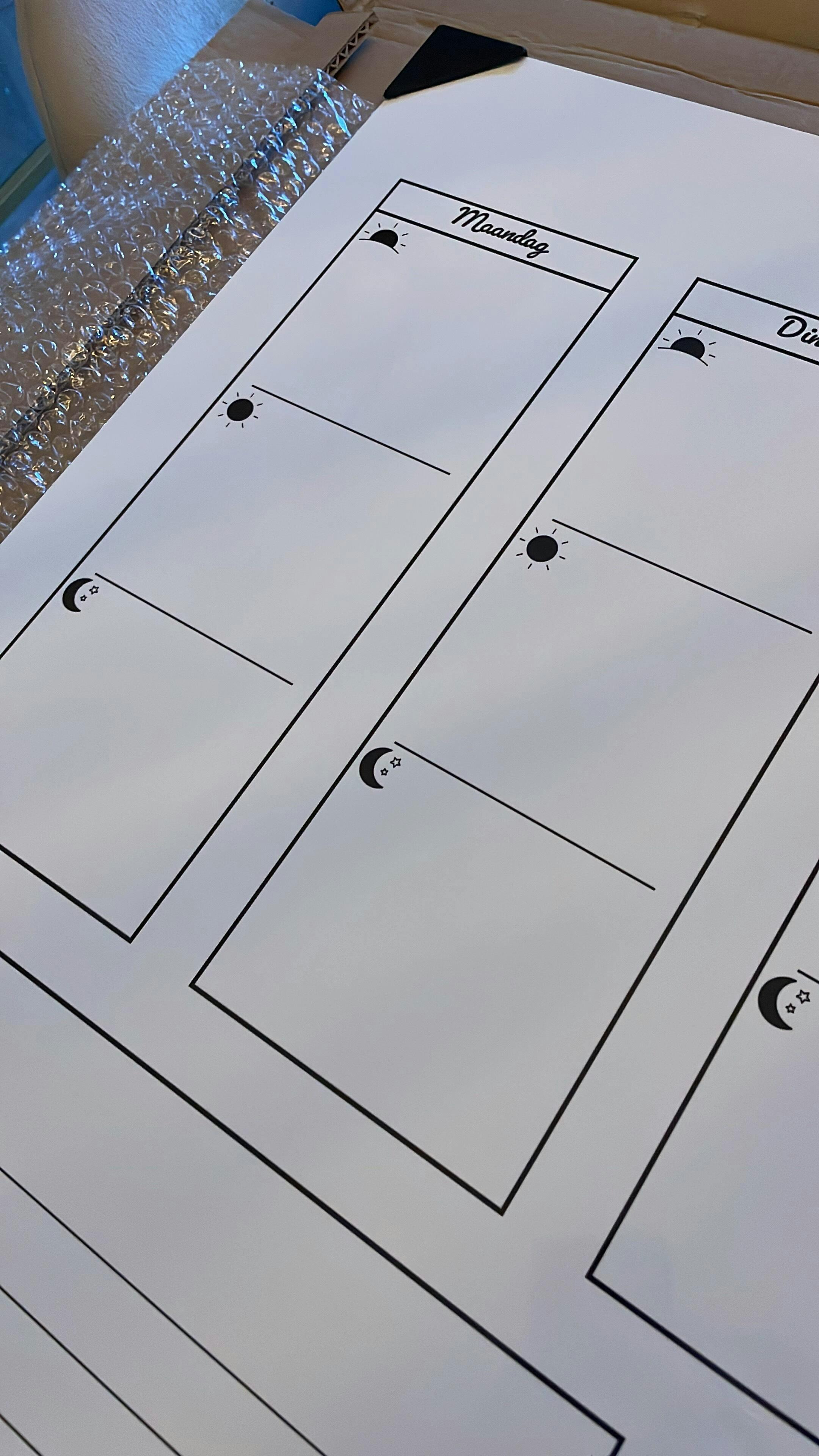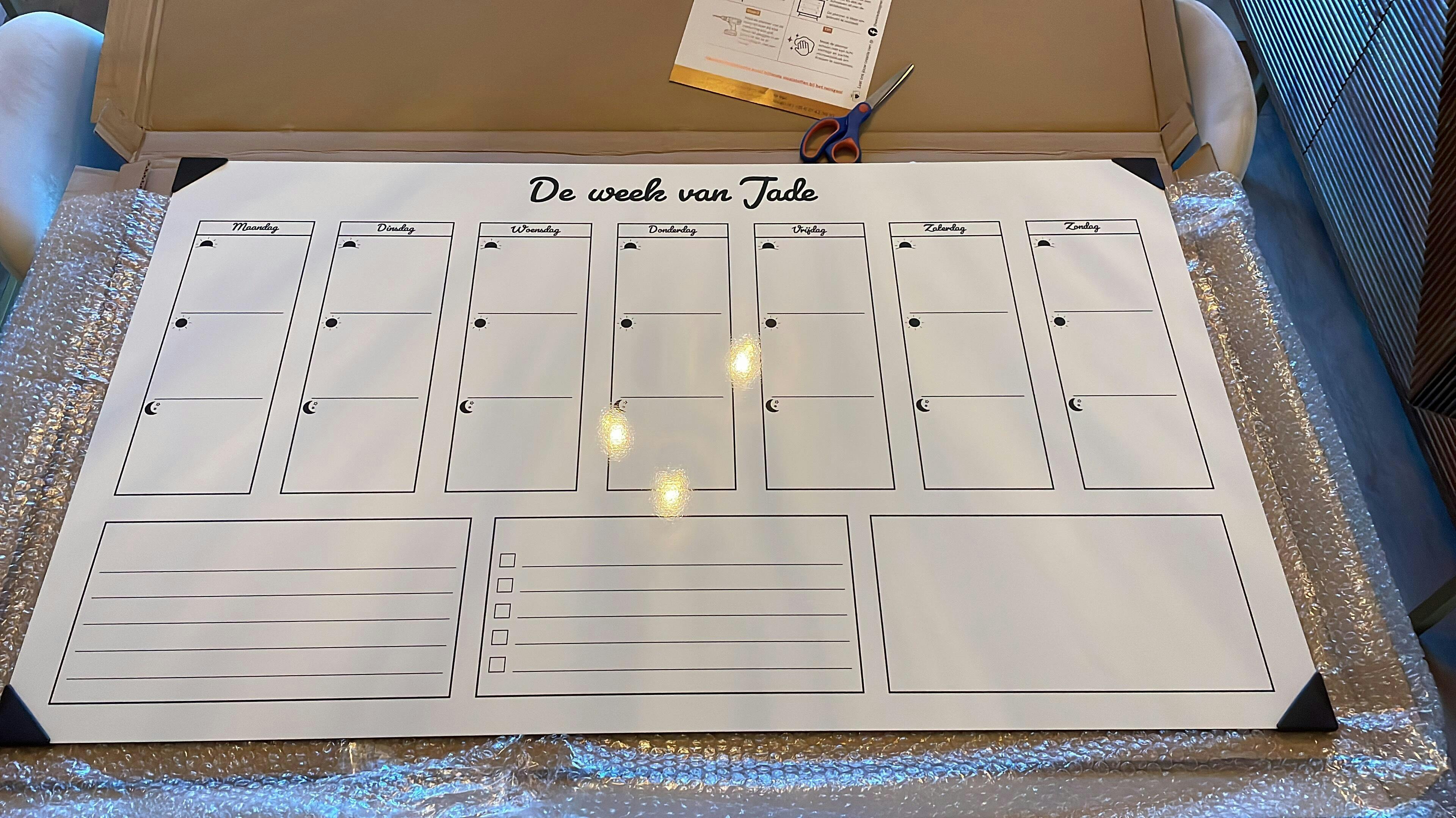 Ik ben heel erg blij met mijn nieuwe weekplanner. De weekplanner is mooi en groot, het is super duidelijk doordat je ochtend, middag en avond icoontjes hebt. Ik heb magneetjes gelabeld met mijn eigen activiteiten en ze passen perfect in de weekplanner. Het enige wat ik jammer vind is dat de letter J niet helemaal goed doorloopt, bij het onderste gedeelte mist er een stukje. Ik vond het erg fijn dat je zelf kunt kiezen hoeveel extra vakken je op je weekplanner wilt. De verzending was ook super snel en de weekplanner was heel goed ingepakt.