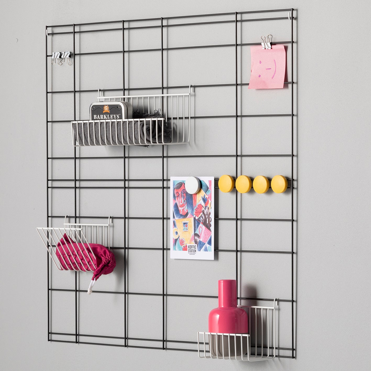 Het wandrek is naar wens samen te stellen door een keuze te maken uit het aantal magneten en het aantal papierklemmen en de kleur daarvan en eventueel voor bevestigingsmateriaal te kiezen.
